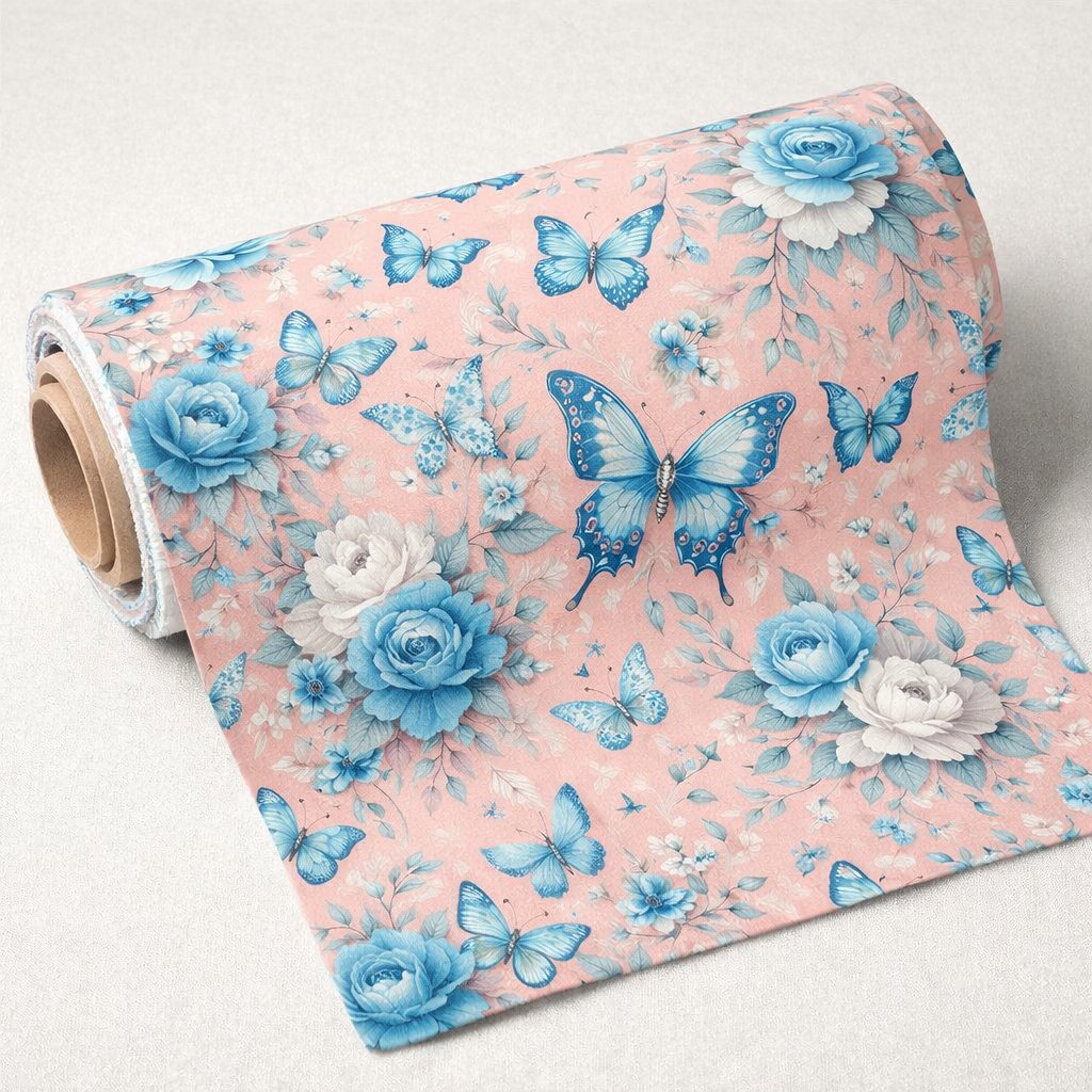 A gentle blend of romance and serenity. This Blue Butterfly fabric features detailed butterflies and blue‑and‑white florals drifting across a soft pink backdrop, creating a dreamy, porcelain‑inspired aesthetic. The pattern is creatively designed to bring a fresh, airy elegance to apparel, décor, bags, and any project that calls for a touch of beauty and calm.