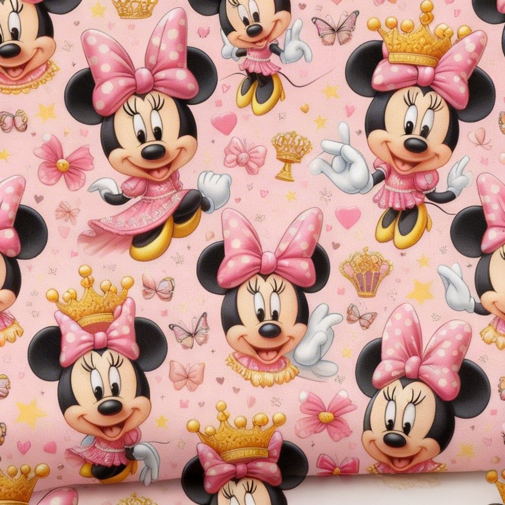 Pretty, playful, and full of charm. Crowned Minnie Mouse features adorable Minnie heads topped with tiny crowns, scattered across a soft pink background for the perfect girly‑glam vibe. The colors pop, the layout is clean, and the whole design brings that sweet, royal Minnie energy your customers love. Creatively designed and vibrant — perfect for apparel, bows, bags, blankets, décor, and any project that needs a touch of pink princess magic.