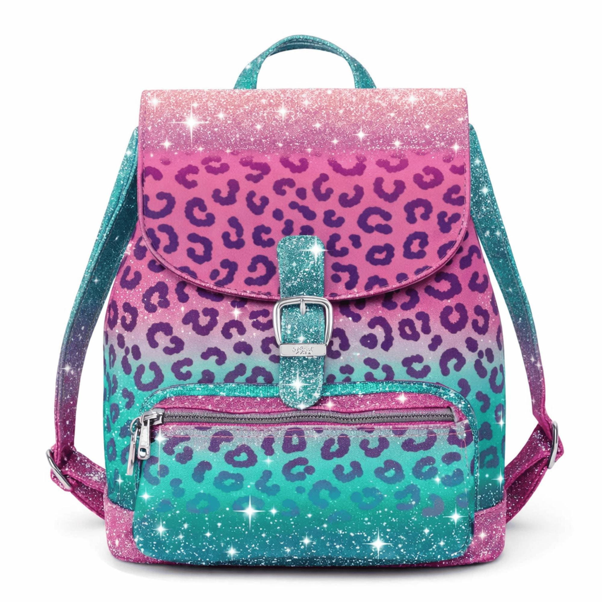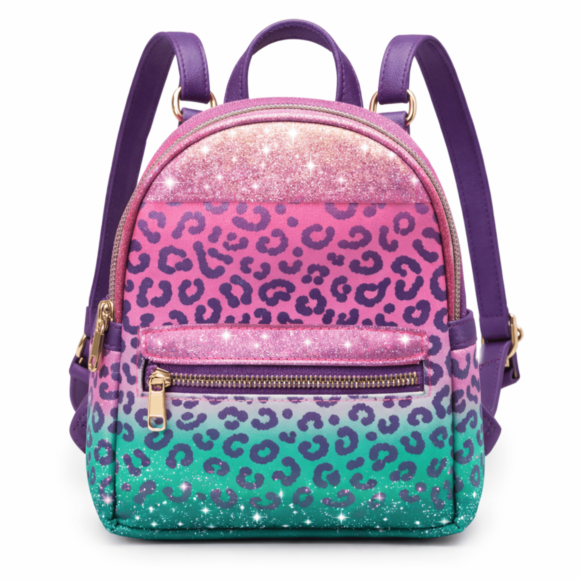 Soft colors, fierce attitude. The Fierce Fade backpack purse blends a light‑teal, light‑pink, and white ombré with a subtle glitter sheen and a smooth leopard print that gives the whole piece a bold, feminine edge. Creatively designed with your signature fade and sparkle, this backpack purse is stylish, lightweight, and perfect for everyday wear. Pretty, practical, and full of personality — a standout accessory for anyone who loves soft colors with a wild twist.