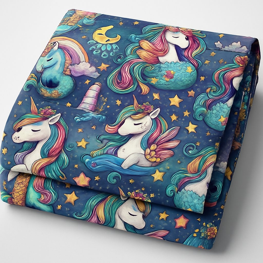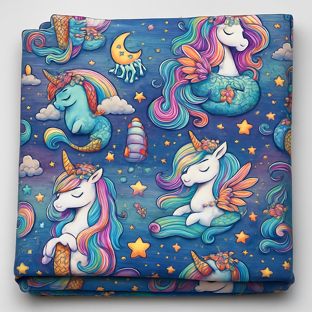 Magical, vibrant, and full of night‑sky wonder. Mystical Flight Unicorn features soaring unicorns with flowing rainbow manes, glowing stars, crescent moons, clouds, and whimsical fantasy details that bring the whole design to life. The deep blue background makes every color pop, giving the fabric a dreamy, enchanted feel your customers instantly fall in love with. Creatively designed, bold, and eye‑catching — perfect for apparel, blankets, bags, bows, décor, and any project that needs a touch of pure magic.