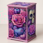 Sweet, edgy, and full of charm. The Rebel & Bloom jewelry box blends romantic skulls, soft hearts, and playful detailing in a design that’s equal parts cute and rebellious. Available in pink, purple, and white, each box is creatively designed with a clean, glossy finish and plenty of room for your favorite pieces. A perfect little statement for anyone who loves pretty with attitude.