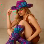 Bright, bold, and beautifully wild. The Savage Wings set pairs creatively designed cowgirl boots with a matching hat covered in vivid butterfly artwork in pink, purple, and teal. The colors glow, the wings feel alive, and the whole look brings that fierce‑meets‑feminine attitude your brand does so well. A standout set for cowgirls who love color, confidence, and a little bit of magic in every step.