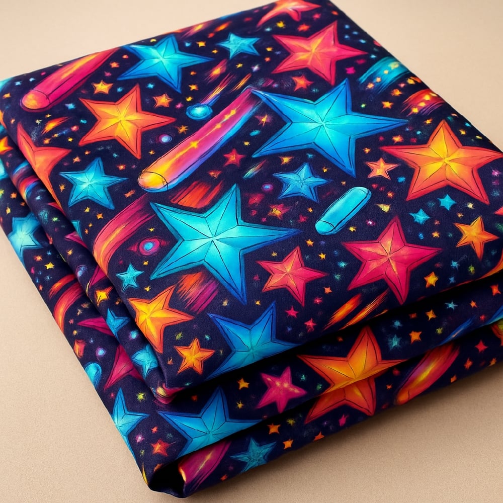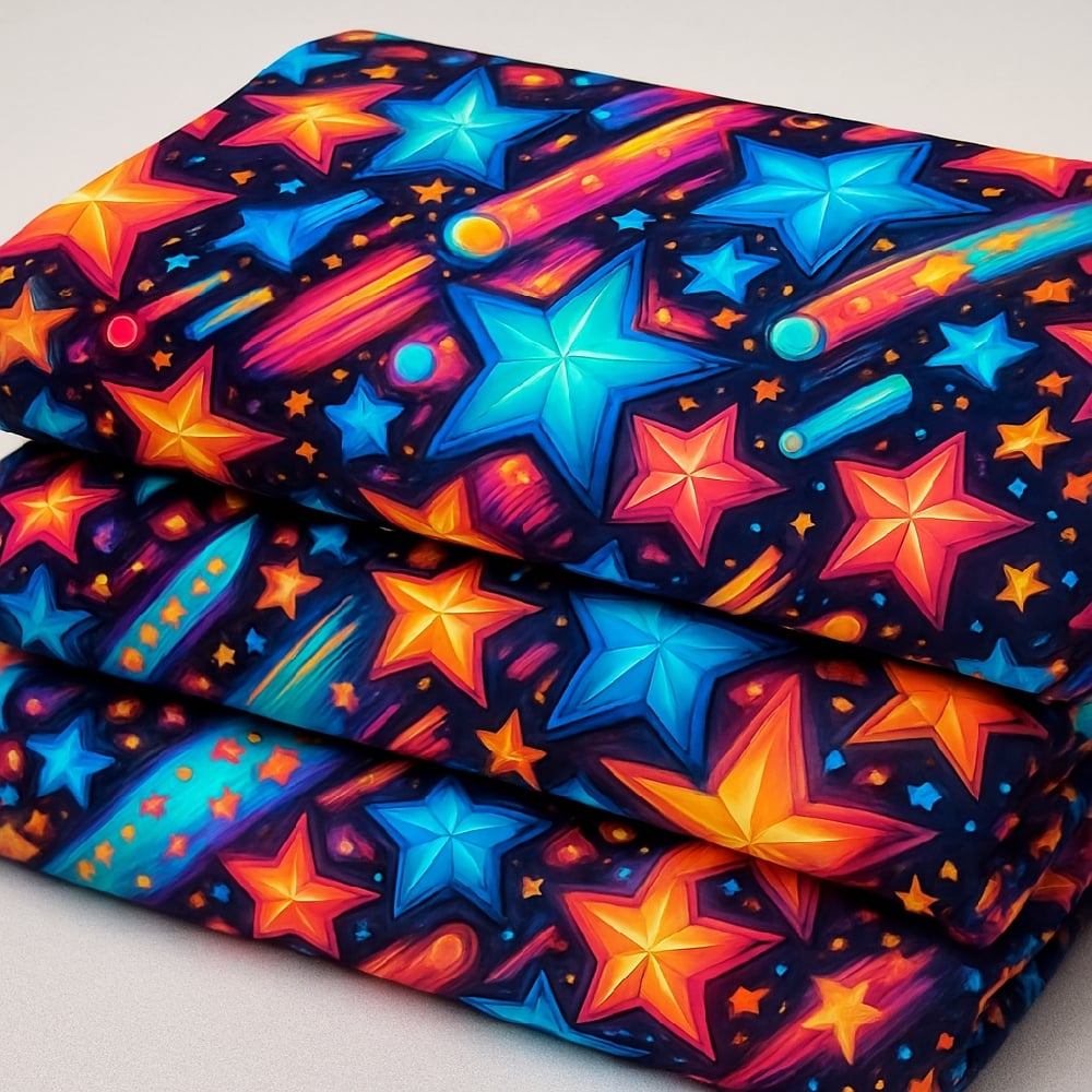 Bright, electric, and full of cosmic sparkle. Starstruck features glowing stars, bold color pops, and a vibrant all‑over layout that instantly grabs attention. The design is creatively crafted to give that premium, boutique look your customers love — perfect for apparel, bows, bags, blankets, décor, and any project that needs a hit of glowing star‑power energy.