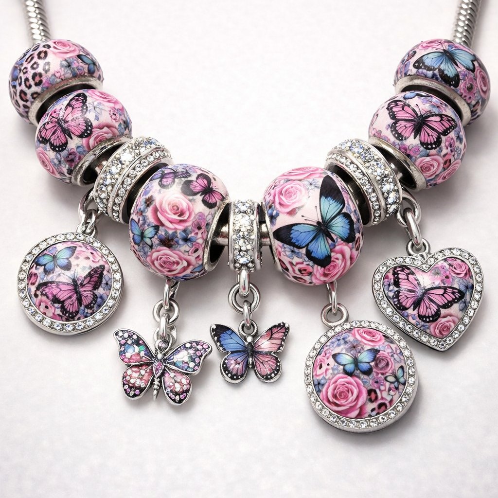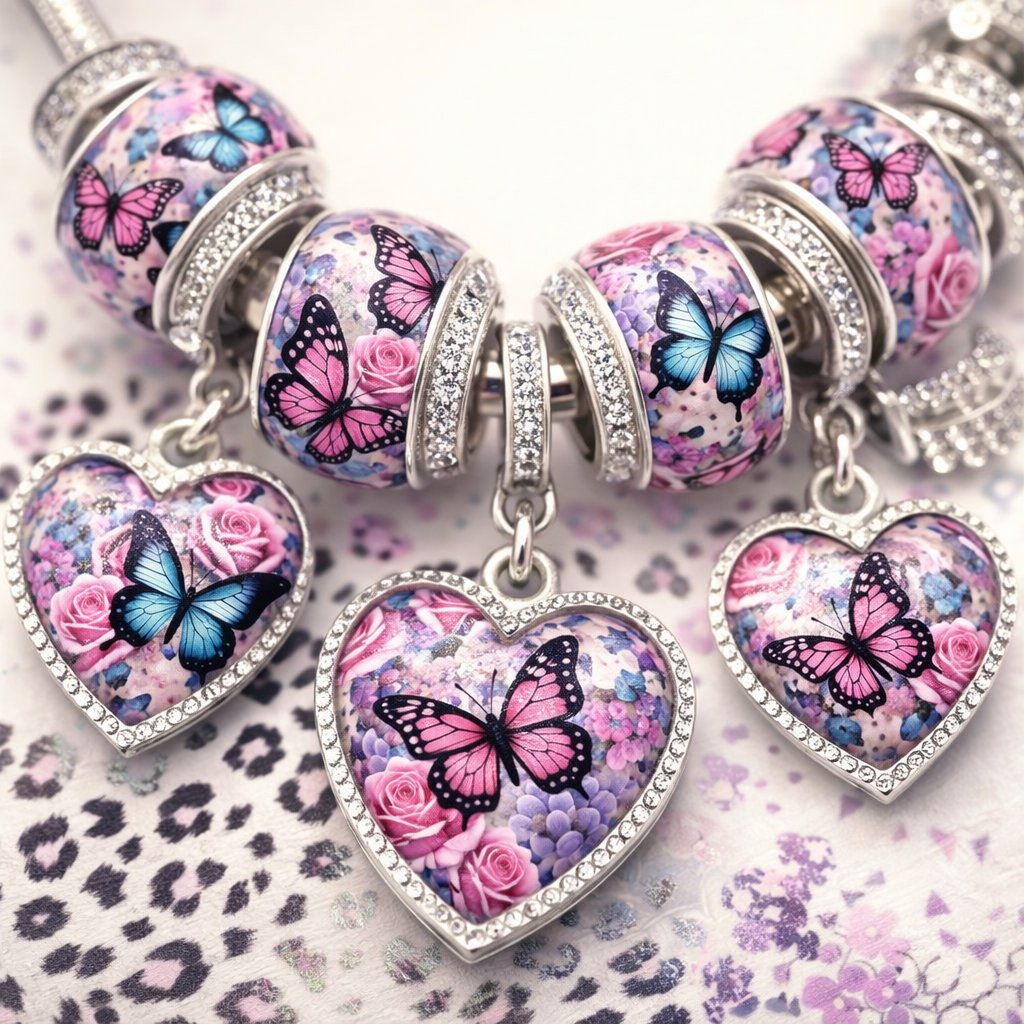 A full burst of color, sparkle, and attitude. The WILD REIGN pack features oversized beads and heart‑shaped charms wrapped in rhinestone brilliance, each one showcasing vivid butterflies, lush florals, and soft pastel tones with a fierce touch of leopard. Every piece is creatively designed to elevate bracelets, keychains, bag charms, and custom jewelry with a luxe, boutique feel. Bold, bright, and ready to reign in any project.